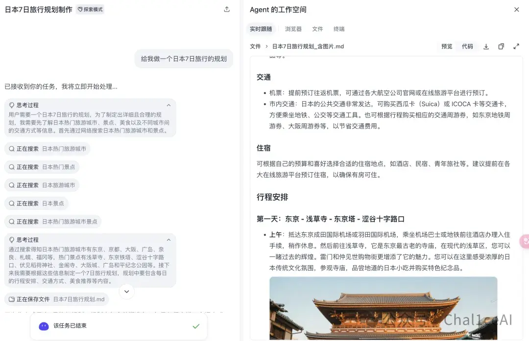 18号晚上抢到了一个扣子空间的邀请码,从那会就开始跑case,可惜的是目前它的效果并不是很理想,当前的体验不如manus、genspark这一类。